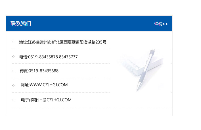 地址:常州市新北區友邦商務大廈1幢16、17層  電話:0519-85101652  傳真:0519-85112595  郵編:213022  網址:www_cz-jiayue_cn.ycjz888.com  郵箱:xiajifengaa@163.com